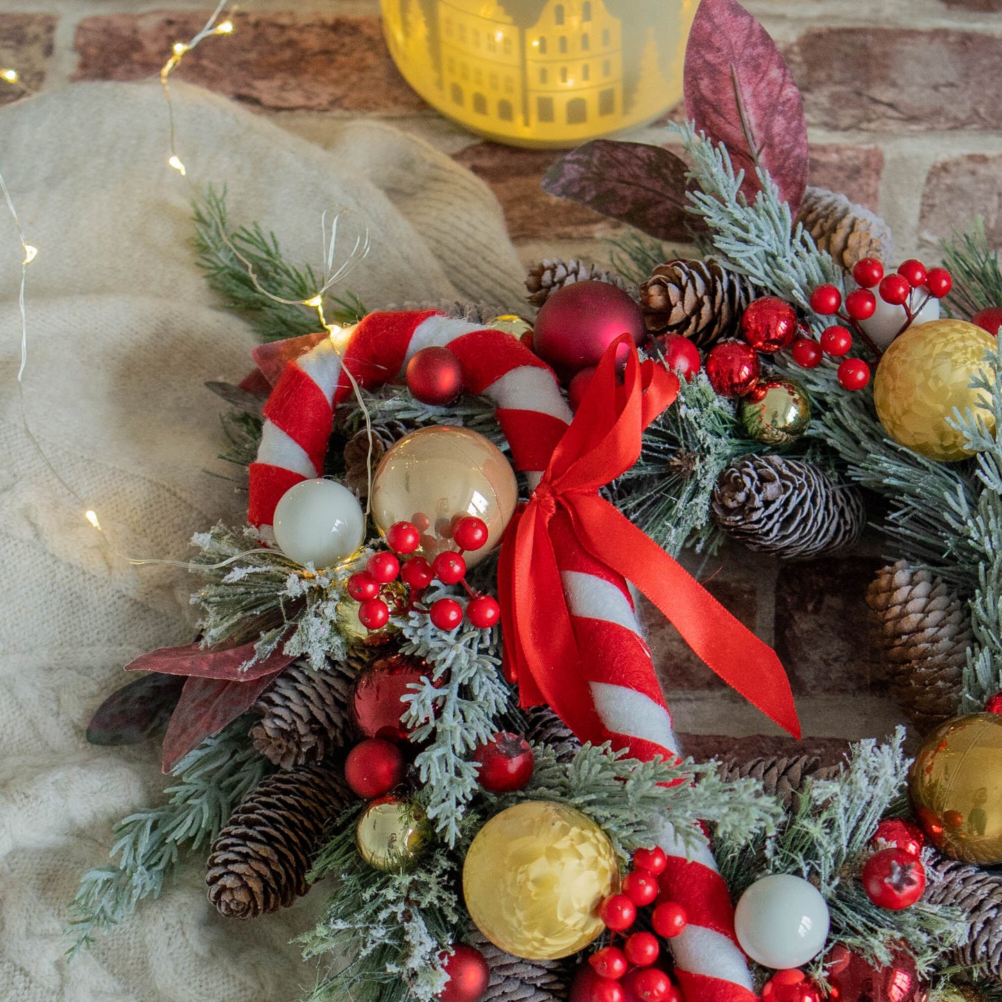 Stunning Christmas wreath, handmade with artificial pine, glass red baubles.